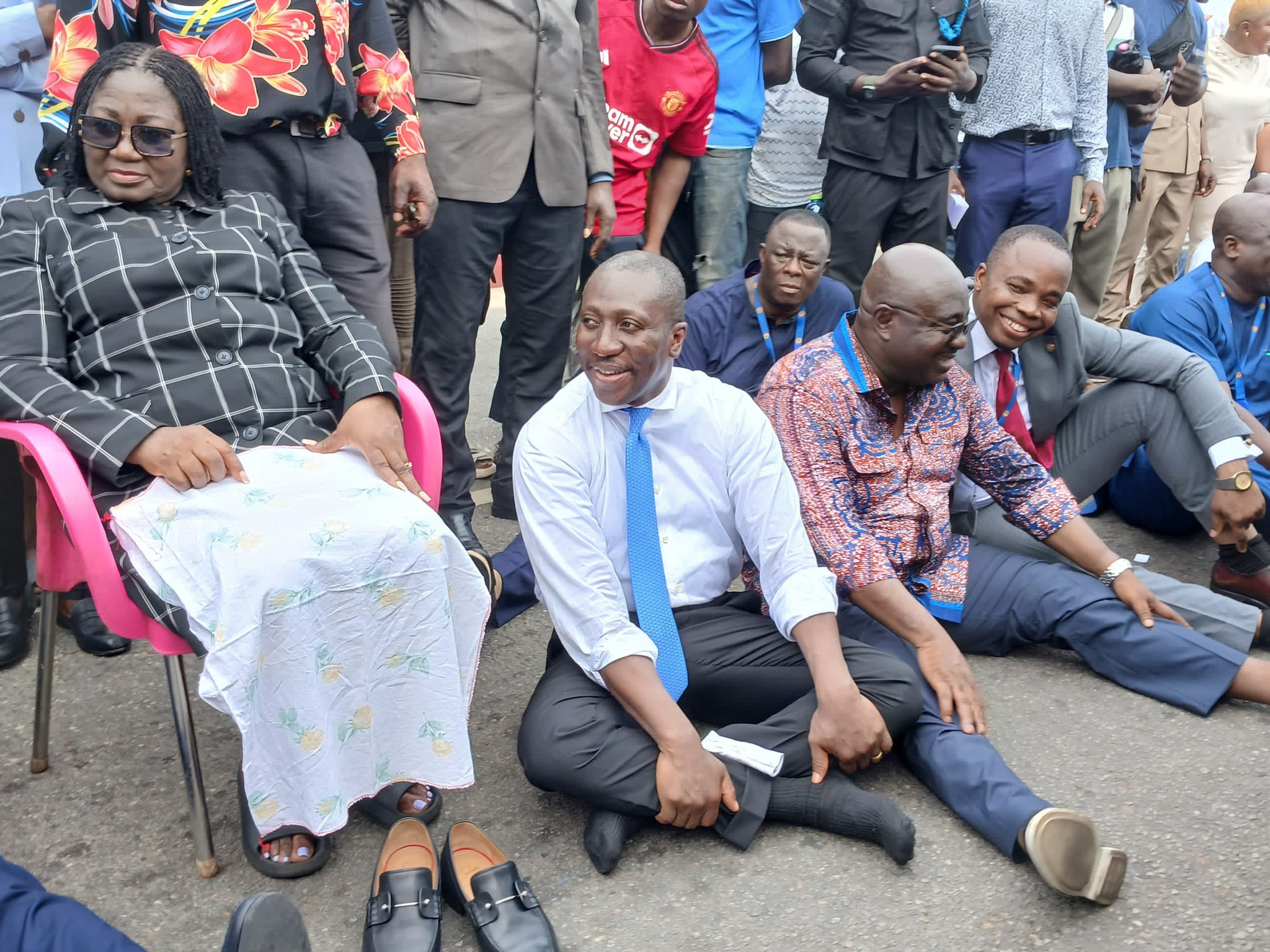 The protest, which began with a march from Parliament to EOCO’s head office in Accra on Thursday, escalated as Minority MPs, led by their Leader Alexander Afenyo-Markin, sat on the floor in symbolic defiance of what they described as “unreasonable” bail conditions imposed on their embattled colleague.
