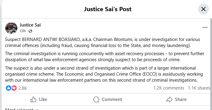 In a Facebook post on Thursday, 28 May 2025, Justice Srem-Sai disclosed that the investigations are not limited to local criminal activities but also form part of a wider international organised crime probe, being undertaken in collaboration with global law enforcement partners.