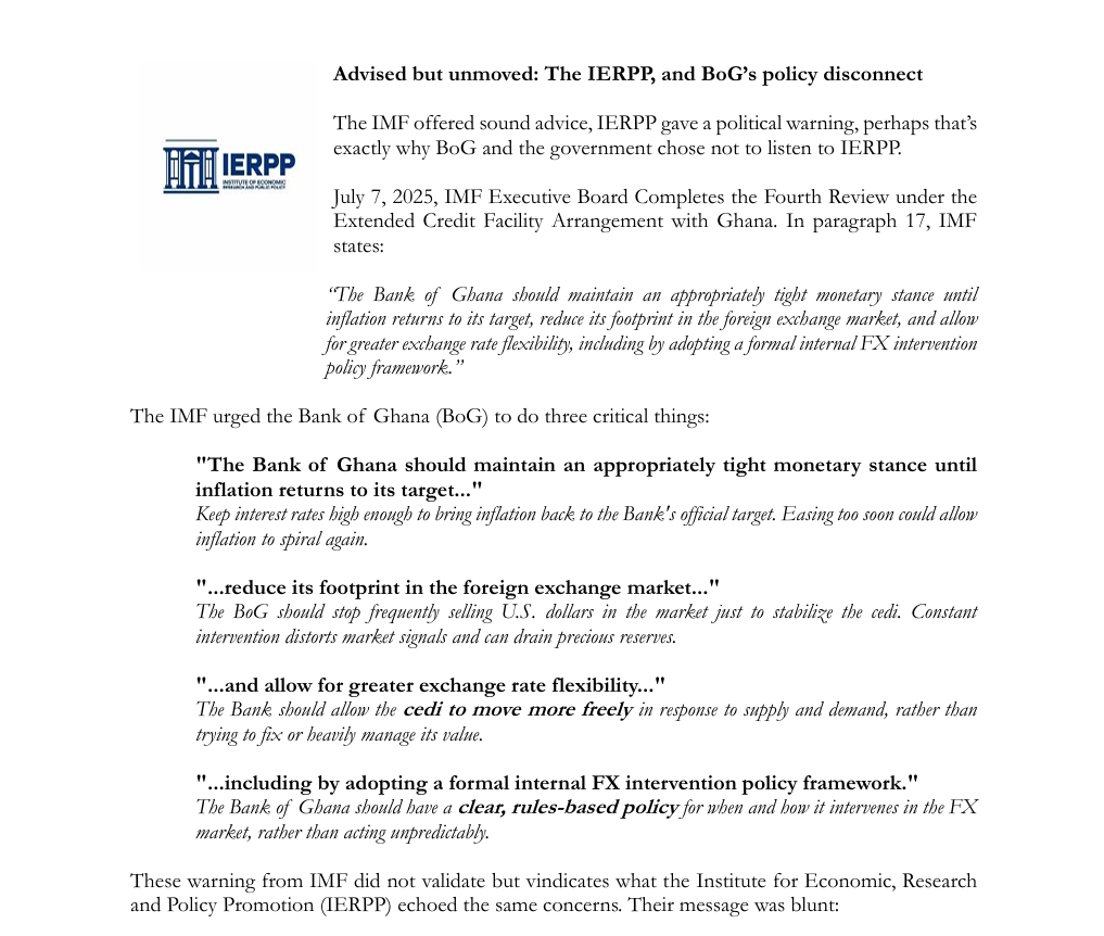 “Despite these aligned warnings, the actions taken by the BoG and government show a clear disregard for both the IMF and IERPP advice.”