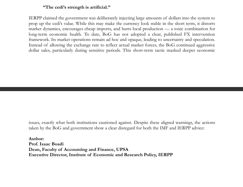 “To date, BoG has not adopted a clear, published FX intervention framework. Its market operations remain ad hoc and opaque, leading to uncertainty and speculation. Instead of allowing the exchange rate to reflect actual market forces, the BoG continued aggressive dollar sales, particularly during sensitive periods. This short-term tactic masked deeper economic issues, exactly what both institutions cautioned against.”