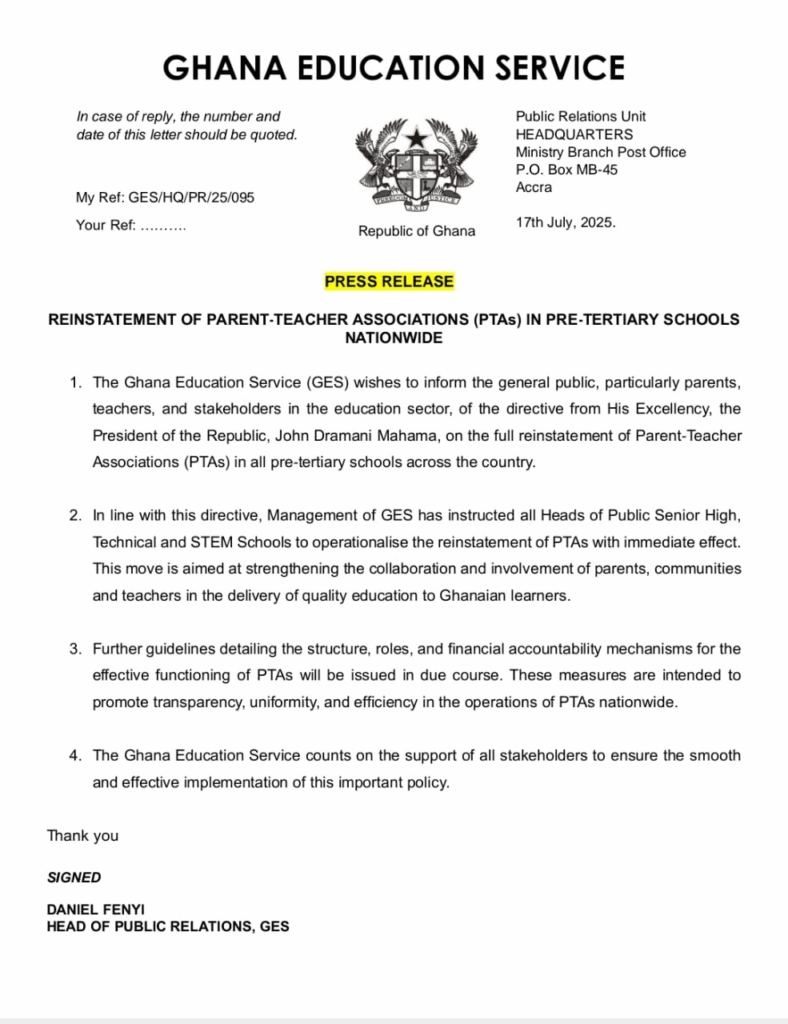 The Ghana Education Service (GES) has announced the full reinstatement of Parent-Teacher Associations (PTAs) in all pre-tertiary schools nationwide, following a directive from President John Dramani Mahama.