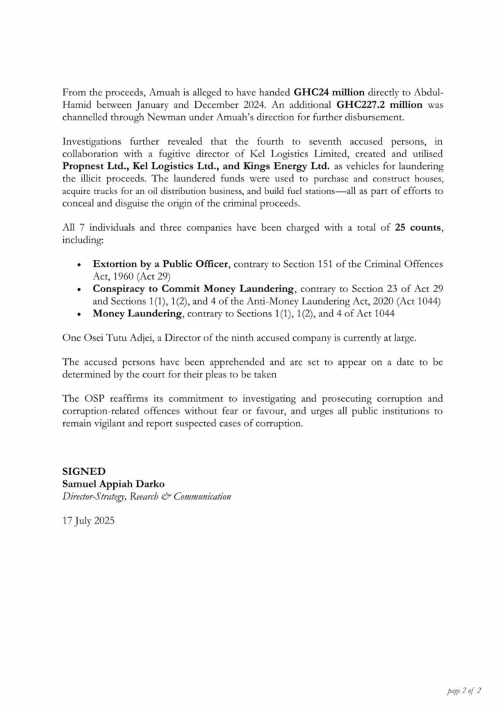 According to the OSP, between 2022 and December 2024, Abdul-Hamid, alongside Jacob Kwamina Amuah—then Coordinator of the Unified Petroleum Pricing Fund—and Wendy Newman, an NPA staff member, orchestrated a criminal scheme to extort payments from petroleum transporters and oil marketing companies.