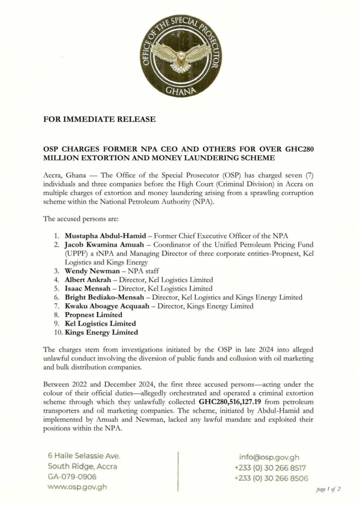 The Office of the Special Prosecutor (OSP) has filed criminal charges against seven individuals and three companies, including the former CEO of the National Petroleum Authority (NPA), Mustapha Abdul-Hamid.