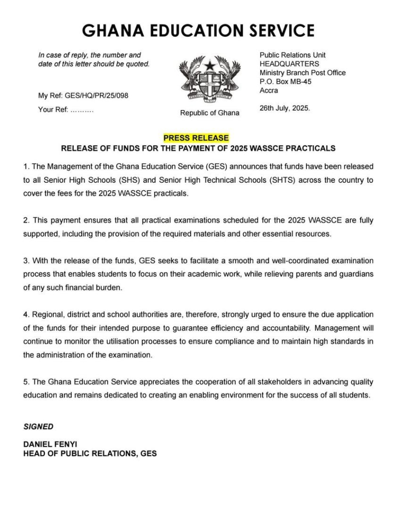 The Ghana Education Service (GES) has announced the release of funds to all Senior High Schools (SHSs) and Senior High Technical Schools (SHTSs) across the country to fully finance the 2025 WASSCE practical examinations.