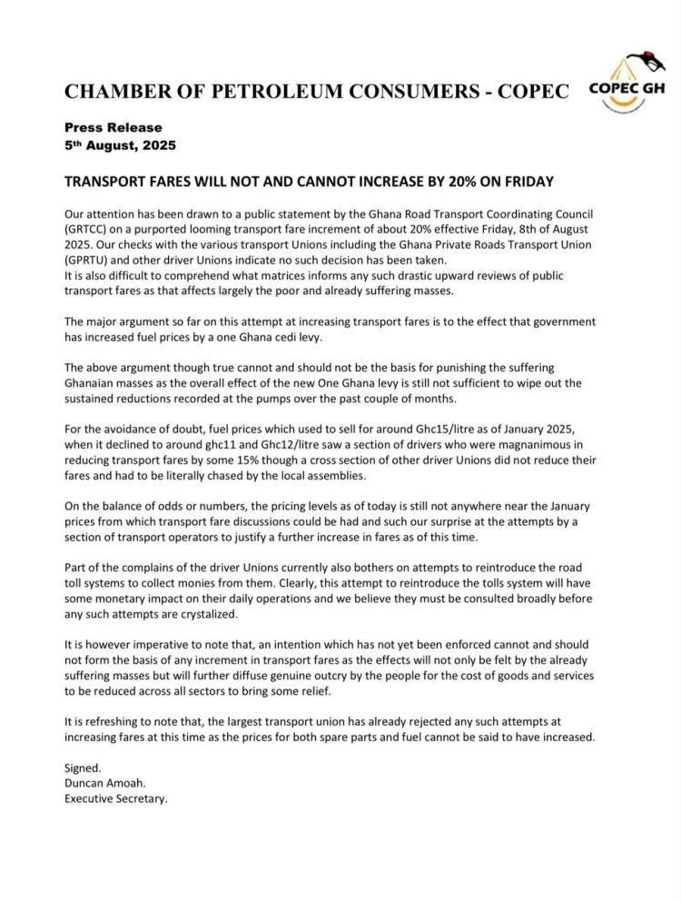 The Chamber of Petroleum Consumers (COPEC) has rejected claims of a looming 20% increase in public transport fares effective Friday, August 8, 2025.