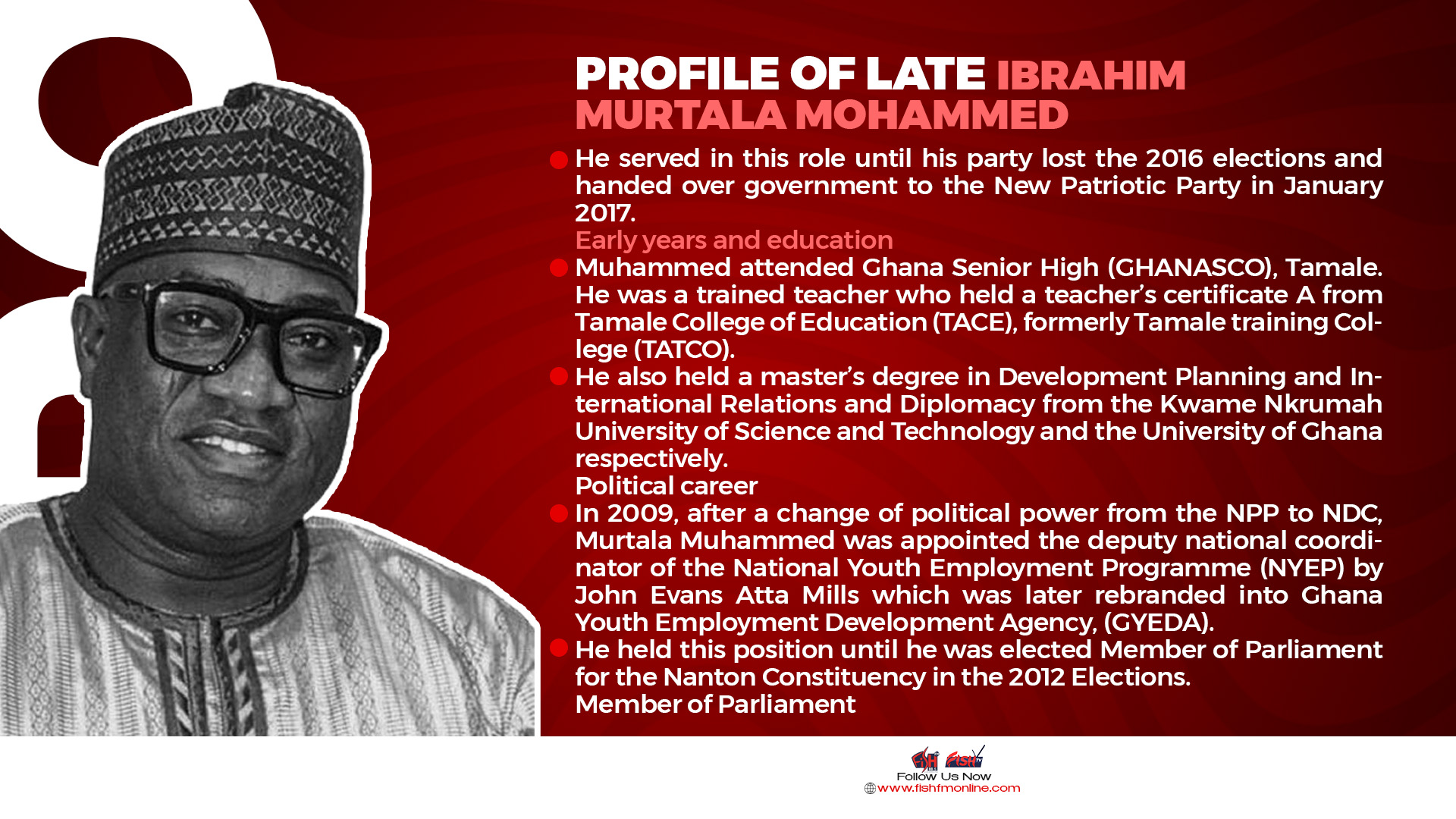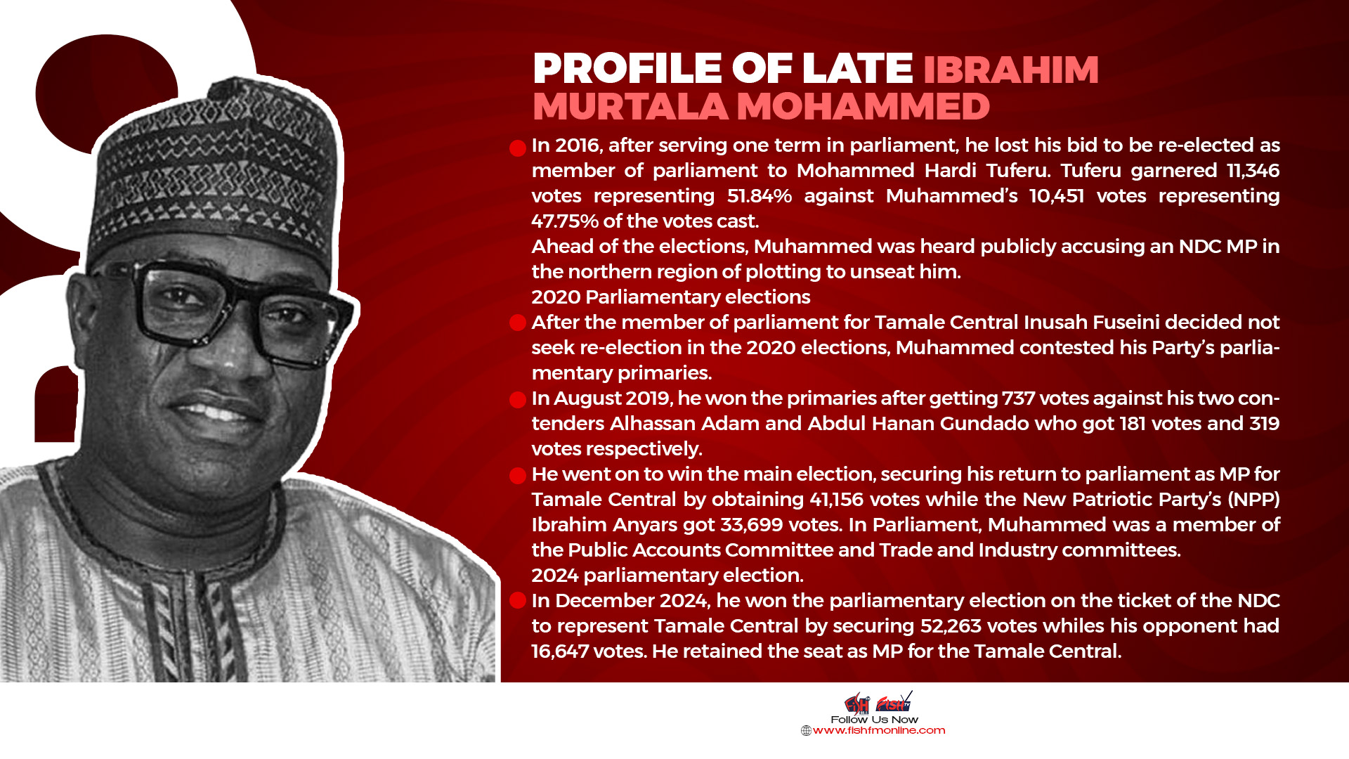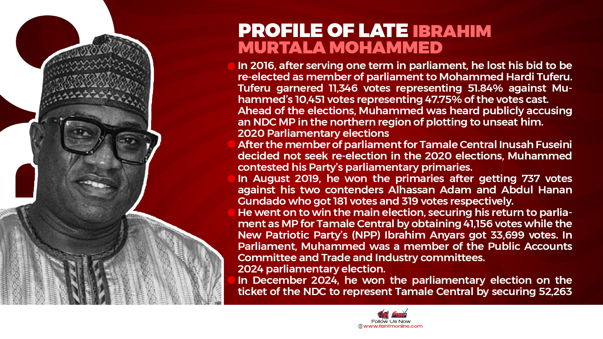 He went on to win the main election, securing his return to parliament as MP for Tamale Central by obtaining 41,156 votes while the New Patriotic Party’s (NPP) Ibrahim Anyars got 33,699 votes. In Parliament, Muhammed was a member of the Public Accounts Committee and Trade and Industry committees.