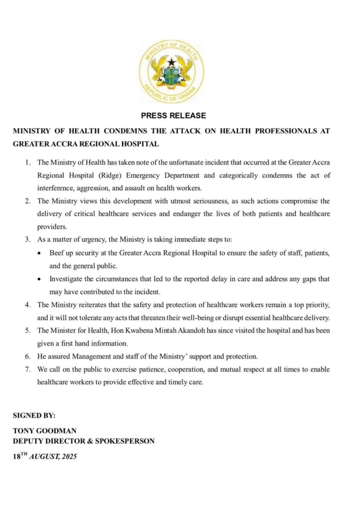 The Ministry of Health has condemned an assault on healthcare workers at the Greater Accra Regional Hospital (Ridge), where a viral video captured relatives of an accident victim clashing with emergency department staff over perceived delays in care.