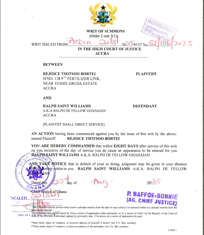 Rejoice Tsotso Bortei, a nurse at Ridge Hospital assaulted during a violent incident involving relatives of a patient on August 17, has filed a GHS 7 million civil lawsuit against social media personality Ralph Saint Williams, also known as “Ralph De Fellow Ghanaian,” for alleged physical assault and defamation.