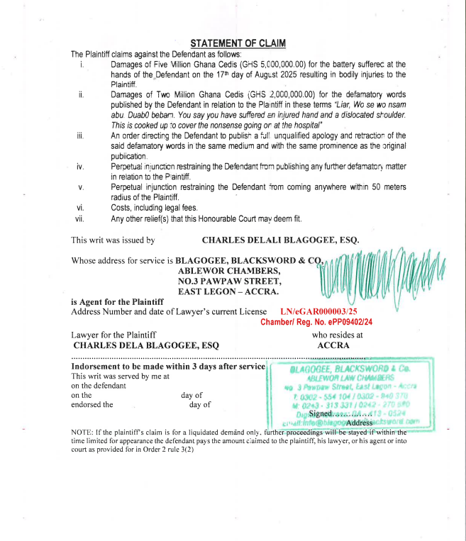 According to a Writ of Summons filed at the High Court in Accra on August 20, 2025, and sighted by newsmen on August 22, Bortei is seeking GHS 5 million for battery and GHS 2 million for defamation.