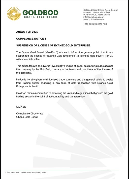 The Ghana Gold Board (GoldBod) has suspended the licence of Evanex Gold Enterprise, a Tier 2 licensed gold buyer, with immediate effect.