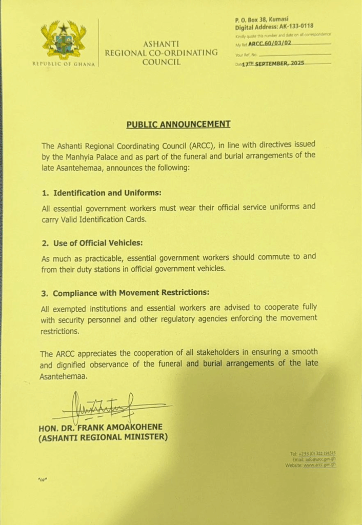 The Ashanti Regional Coordinating Council (ARCC) is admonishing residents in the Greater Kumasi metropolis to abide strictly with directives from the Manhyia palace as the late Queenmother, Nana Konadu Yiadom III is laid to rest on Thursday September 18, 2025.