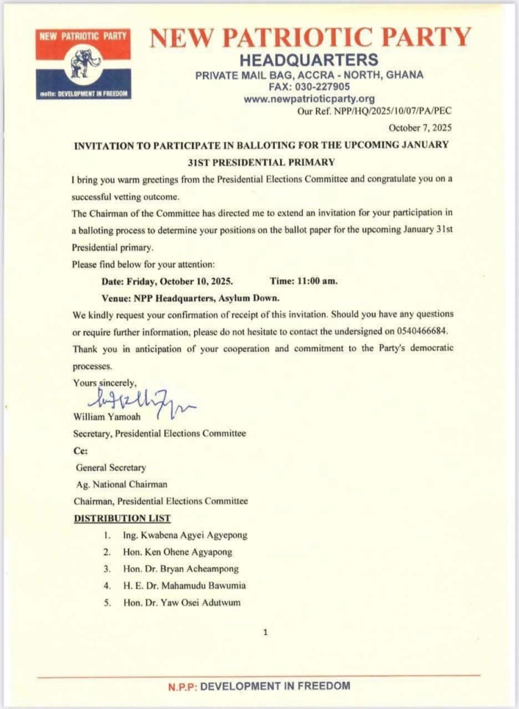 NPP sets Oct. 10 for balloting ahead of 2026 presidential primary