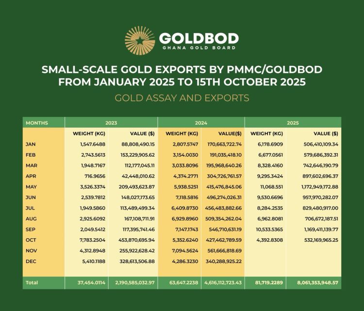 Ghana’s small-scale gold export sector has generated over US$8 billion in foreign exchange between January and 15th October 2025, according to new figures from the Ghana Gold Board (GoldBod) and the Precious Minerals Marketing Company (PMMC).