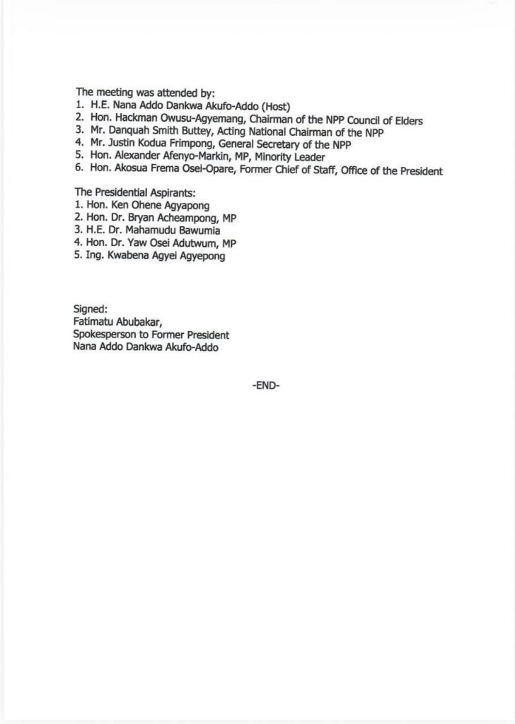 Also present at the meeting were senior NPP officials including the Chairman of the Council of Elders, Hackman Owusu-Agyemang; Acting National Chairman, Danquah Smith Buttey; General Secretary, Justin Kodua Frimpong; Minority Leader in Parliament, Alexander Afenyo-Markin; and former Chief of Staff, Akosua Frema Osei-Opare.