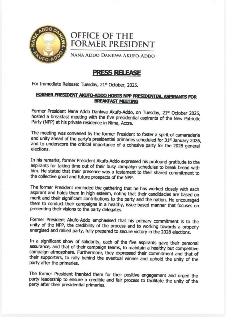 Former President Nana Addo Dankwa Akufo-Addo has hosted all five New Patriotic Party (NPP) presidential aspirants at his private residence in Nima, Accra, for a breakfast meeting aimed at fostering unity ahead of the party’s upcoming presidential primaries.