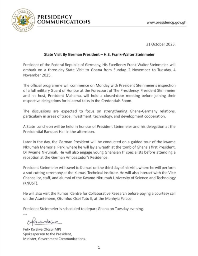 The President of the Federal Republic of Germany, His Excellency Frank-Walter Steinmeier, is set to embark on a three-day State Visit to Ghana from Sunday, November 2, to Tuesday, November 4, 2025.