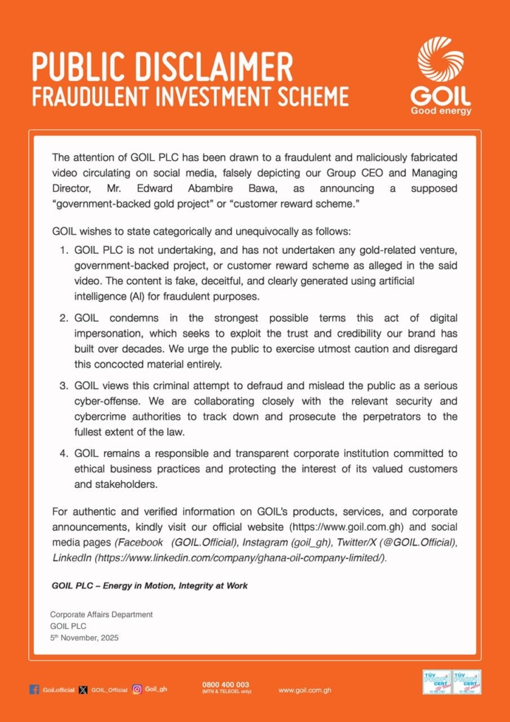 GOIL PLC has rubbished a fraudulent and maliciously fabricated video circulating on social media, falsely depicting its Group Chief Executive Officer (CEO) and Managing Director, Edward Abambire Bawa, as announcing a supposed “government-backed gold project” or “customer reward scheme.”