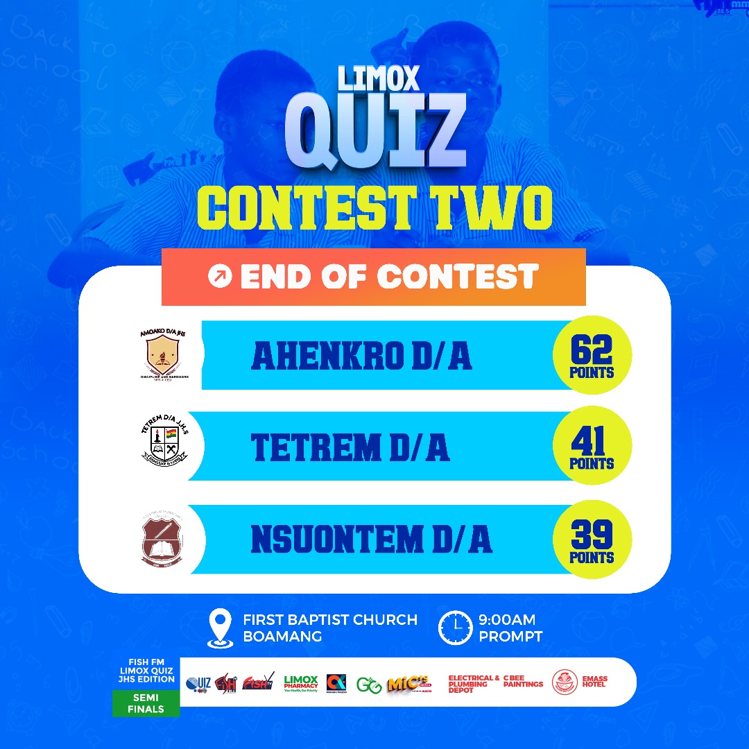 Ahenkro DA JHS took the top spot in the second contest with 62 points, ahead of Tetrem DA JHS with 41 points, and Nuontem DA with 39 points.