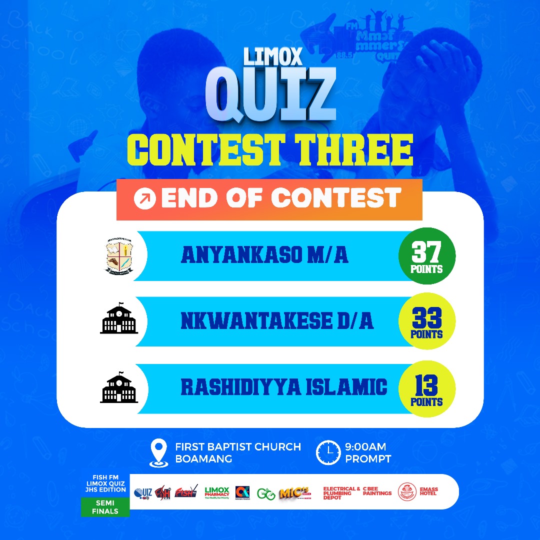 Offinso Anysnkaso JHS claimed the top spot in the third contest with 37 points, beating Nkwantakese DA JHS with 33 points, and Tetrem Rashidiyya Islamic JHS with 13 points.