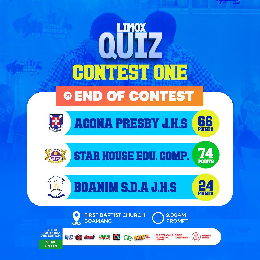 In the first contest, Star House Educational Contest emerged victorious with an impressive 74 points, followed closely by Agona Presbyterian JHS with 66 points, and Boanim SDA with 24 points.