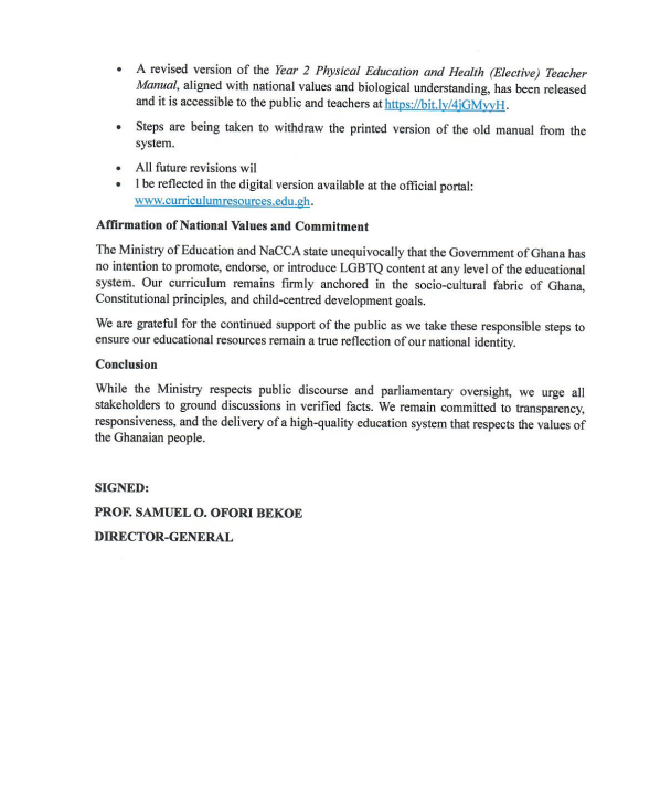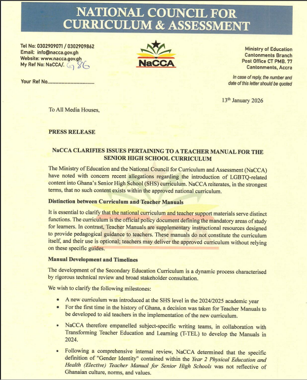 In a statement issued the same day, NaCCA clarified the distinction between the official SHS curriculum and teacher support materials, stressing that the curriculum itself contains no LGBTQ-related content. The council noted that teacher manuals are supplementary resources meant to guide educators, and their use is optional.