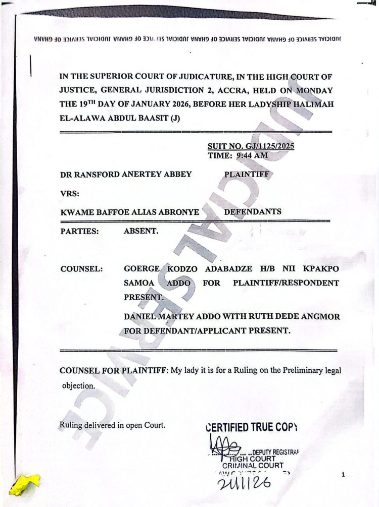 Dr Abbey filed the suit on August 26, 2025, alleging that Mr Abronye had made defamatory broadcasts and publications that harmed his reputation. The action sought personal redress for the alleged defamation.