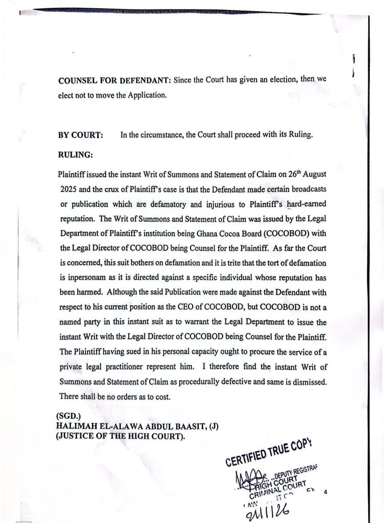 The High Court in Accra has dismissed a defamation suit filed by the Chief Executive Officer of the Ghana Cocoa Board (COCOBOD), Dr Ransford Anertey Abbey, against the Bono Regional Chairman of the New Patriotic Party (NPP), Kwame Baffoe Abronye.