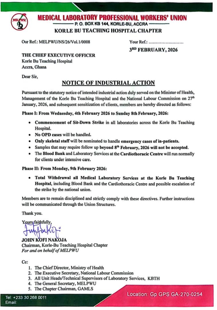 The situation is set to escalate severely starting Monday, February 9, 2026. In this second phase, the union has announced a total withdrawal of all medical laboratory services across the entire Korle Bu Teaching Hospital.