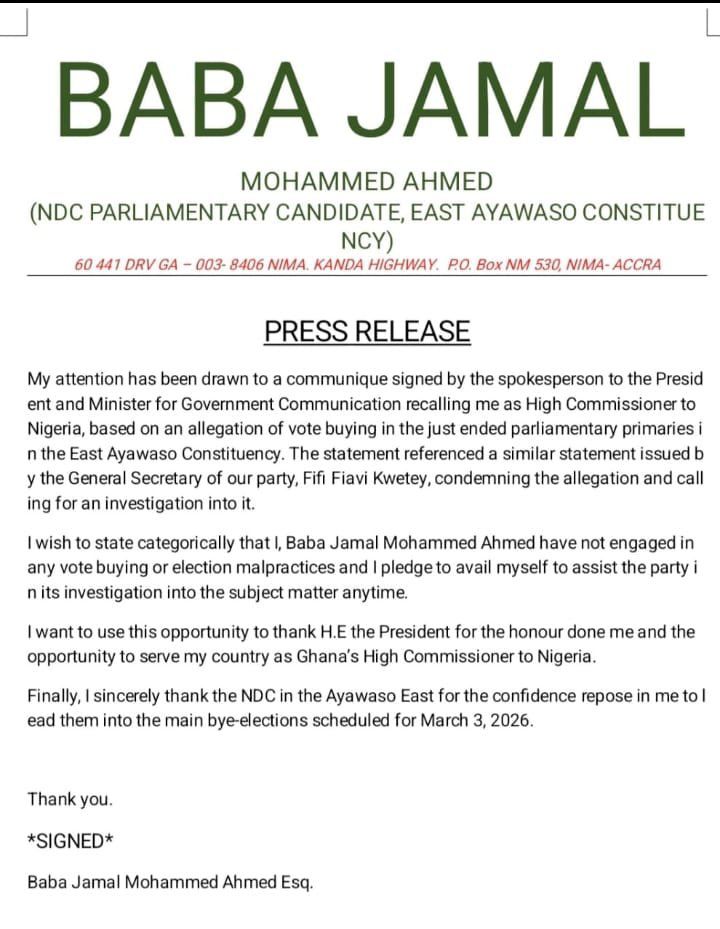 Mohammed Baba Jamal Ahmed, the National Democratic Congress (NDC) parliamentary candidate for Ayawaso East, has denied allegations of vote buying during the February 7 NDC primary, which reportedly led to his recall as Ghana’s High Commissioner to Nigeria by President John Dramani Mahama.