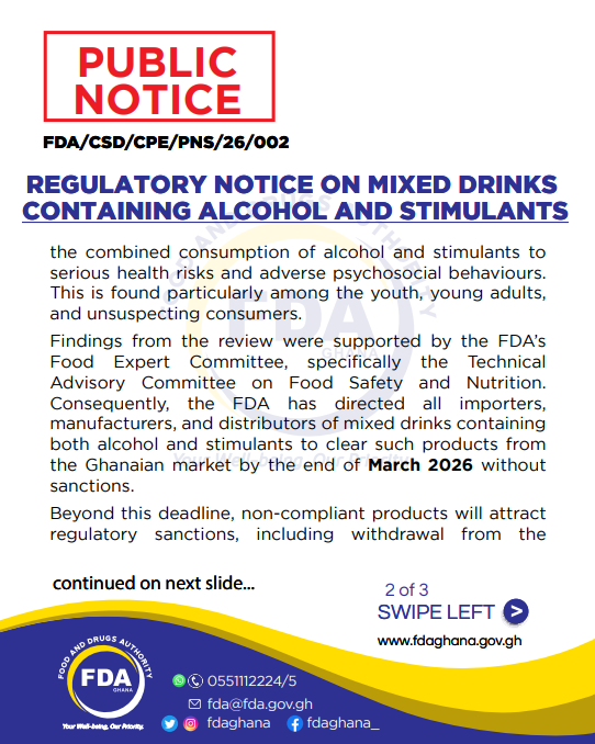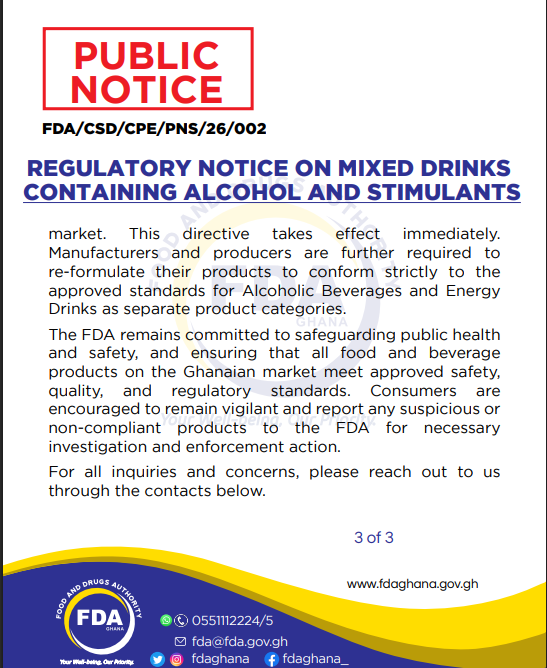 The Food and Drugs Authority (FDA) has ordered all importers, manufacturers, and distributors of mixed drinks containing both alcohol and stimulants, such as caffeine, inositol, glucuronolactone, ginseng, and guarana, to remove these products from the Ghanaian market by the end of March 2026.