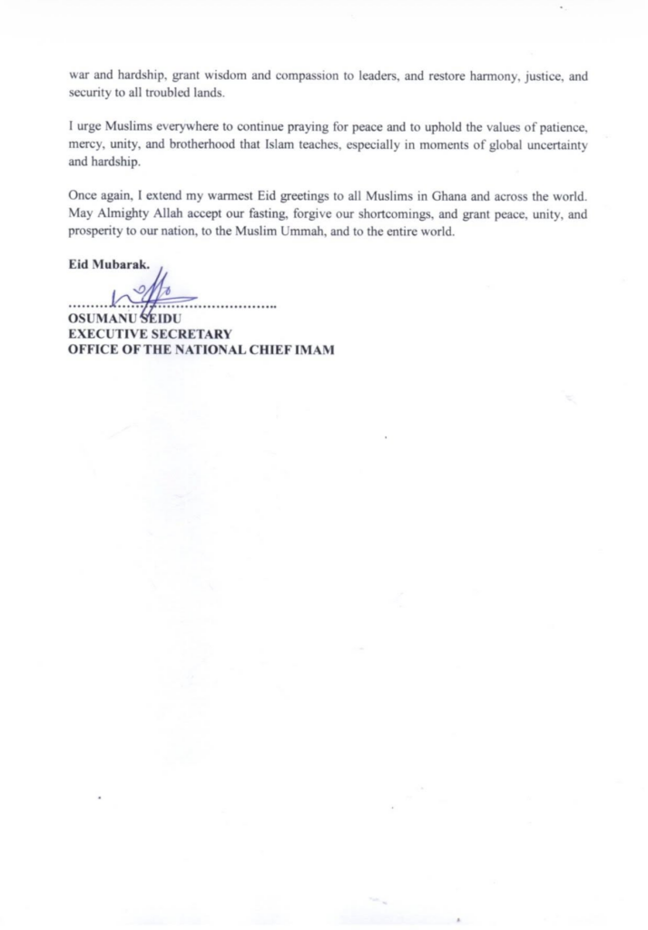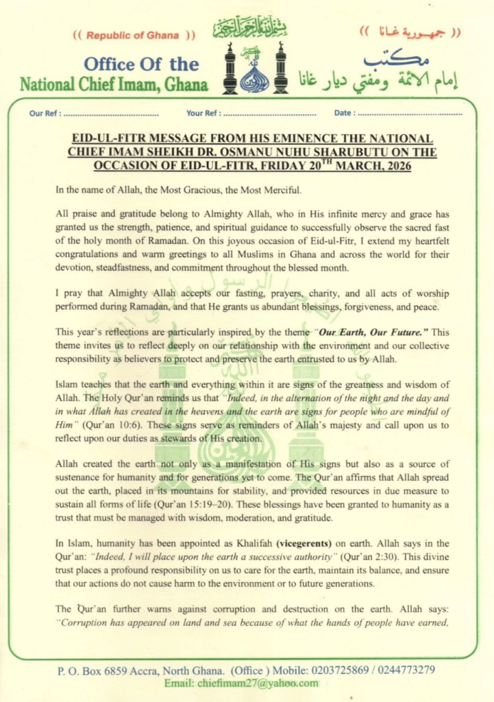 The statement, signed by the Executive Secretary to the Office of the National Chief Imam (Shaikh Dr Osman Nuhu Sharubutu), Osmanu Seidu, extended warm felicitations to Muslims in Ghana and across the globe following the successful completion of the fasting period of Ramadan.